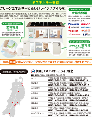 | メッセージ | 伊藤忠エネクスグループでは、約4,000棟にも及ぶ太陽光発電システムの設置実績があります。弊社は東北エリアにおいて、同業他社に先駆け積極的に太陽光発電システムの御提案・販売を開始しております。弊社はお客様のエネルギーの御利用状況を基に、最適なエネルギーの御提案を行っております。また、一般家庭以外にも集合住宅や空地、工場屋根等への太陽光発電システムの設置についても御提案しております。現在、無料エコ診断を実施しておりますので、まずは一度、信頼と実績の弊社までお気軽にお問合せ下さい。 |